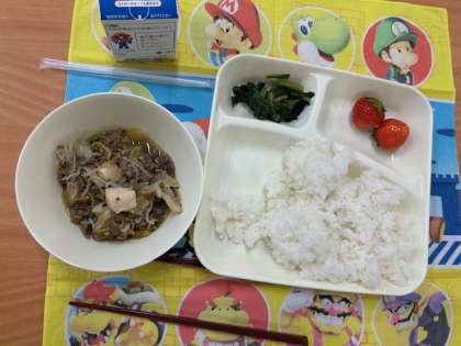 今日の献立は、ごはん、牛乳、すき焼き煮、ほうれんそうのおひたし、いちごです。