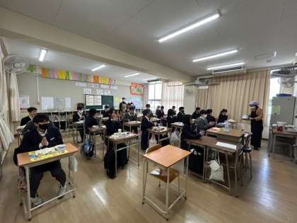 今日のすき焼き煮にはとうふが入っています。とうふは、大豆からつくられています。まず、水につけた大豆をすりつぶしてしぼり、豆乳をつくります。その豆乳に、固めるもとになる「にがり」を加え、とうふができあがります。大豆のおいしさと栄養がつまった食べ物です。今日は9年1組の様子です。手を合わせて「いただきます!」