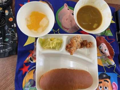 今日の献立は、黒糖パン、牛乳、あげどりのバーベキューソース、カレースープ、キャベツとコーンのサラダ、フルーツゼリーです。今日は「卒業祝い献立」6年生、9年生をお祝いする気持ちがこめられ、いつもより品数も一品多くなっています。
