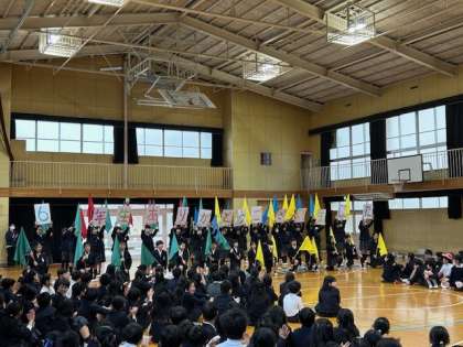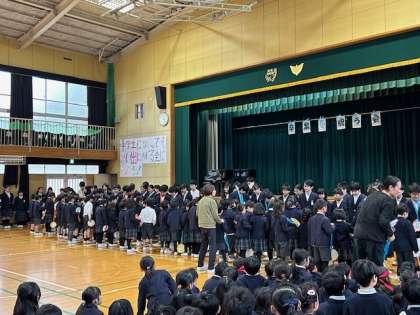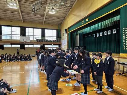 5年生の出し物に続き、たてわり班の代表からメッセージカードのプレゼントが、また1年生からメダルのプレゼントがありました。