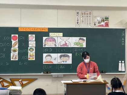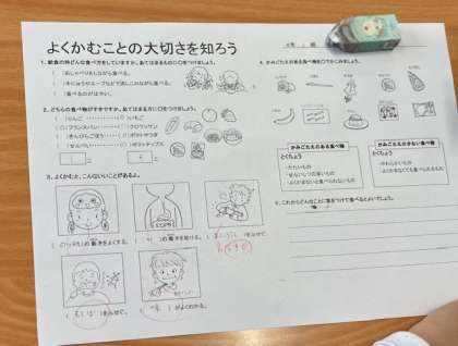 今日のテーマは「よくかむこと」。かむことが体にもたらすよい影響や、かみごたえのある食べ物について学習しました。