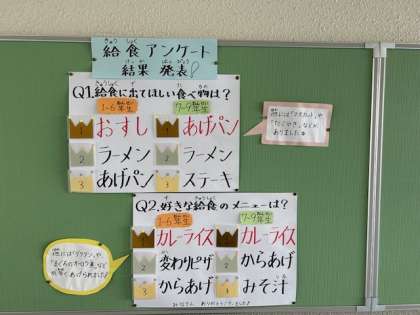 以前、児童生徒対象にとった給食のアンケート結果がオープンスペースに掲示されています。好きなメニューの1位はやはり小中ともにカレーライス!カレーライスの日は子どもたちのテンションも心なし高いように感じます。給食に出てほしい食べ物1位は小中でわかれましたが、2位はなんと小中ともにラーメン!