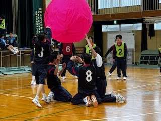 キンボールとは、直径122cm・重さ1kgという巨大で軽いアドバルーンのようなボールを床に落とさないよう、チームで協力し合う競技です。