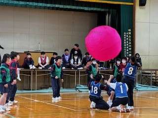 大きなボールを4人1チームを作り、フィールド内では3チームで競技を行いました。