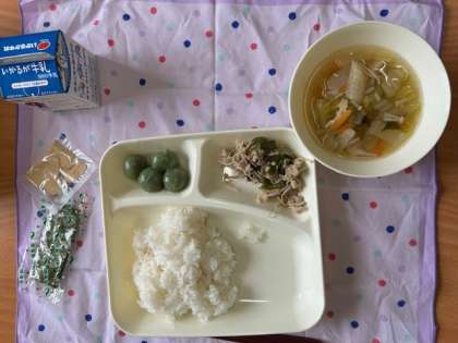 今日の献立は、ごはん、牛乳、豚肉と野菜のいためもの、五目汁、よもぎだんご、きな粉、焼きのりです。給食のよもぎだんごは、うるち米、もち米、よもぎからつくられています。よもぎは、山や野原で自然に生えている春の野草です。やわらかな新芽をすりつぶして、だんごを入れます。