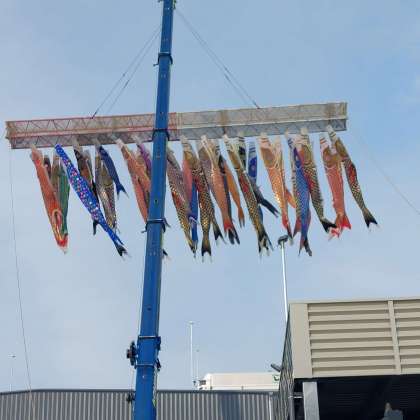 この度、(株)アチハさんにお声をかけていただき、クレーン鯉のぼりに本校2年生(現3年生)が作成したジンベイザメ(みなみザメ)が一緒に泳ぐことになりました。