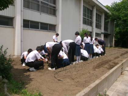 3年1組、2組、ともに授業時間中に作業をおこない、一人一本ずつ植えていきました。中には苦戦する生徒や、もう一度植えつけをやり直しする場面もありましたが、お休みの生徒をのぞき、無事全員の苗を植え付けることができました。