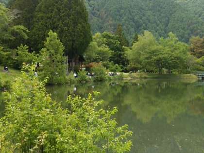 池のほとりで昼食です。