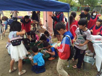 校長先生が、「ぜひこどもたちに金魚すくいをしてもらいたい」ということで、南港南中学校金魚すくい店がオープンしました。