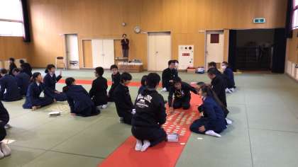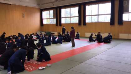 上の句の1字を聞いて取れる子もいれば、すぐ目の前にあるのに相手チームにとられて悔しがる子もいて大盛り上がりでした。