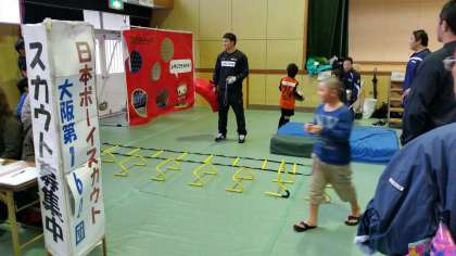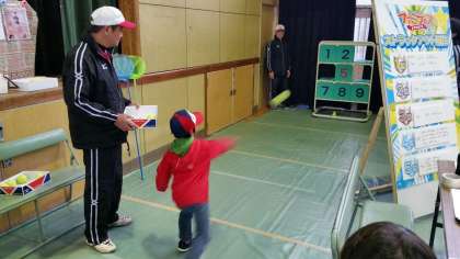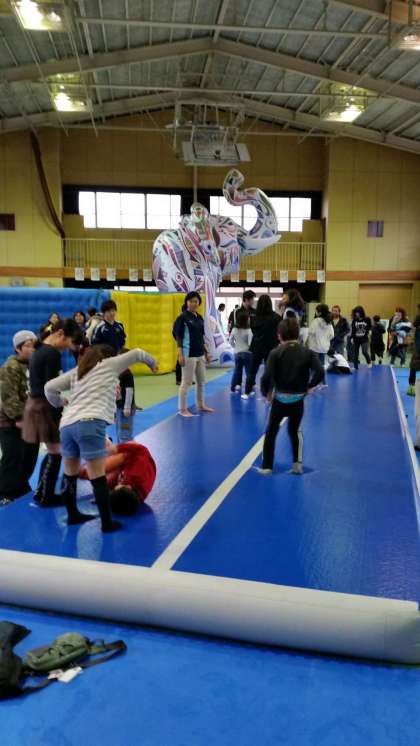 今日は夜中からの雨が降り続く天候で、以前から準備を進めてこられた南港ポートタウンファミフェスも大ダメージ。人の足もないのではと思いつつやってきました!さすがに公園内の飲食エリアは人影もまばらです。雨天時使用予定になっている本校体育館をのぞいてみました。するとなんとこちらは大盛況!家族連れがいっぱいでロングマットで跳び跳ねる子、ストラックアウトに挑戦する子。昨年も好評だったNTT