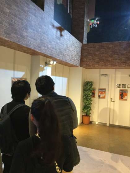 左の写真は、ドローンを飛ばしている様子です。一度シュミレータで練習をしてから、実際のドローンを操作しました。