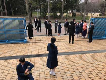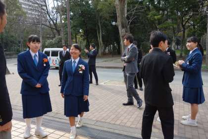 先生たちのお出迎えと、在校生からコサージュをつけてもらったり。