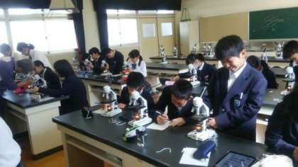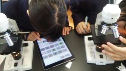 この日の理科の授業は、顕微鏡とiPadを使って池の水にどのような生物がいるかを観察しました。