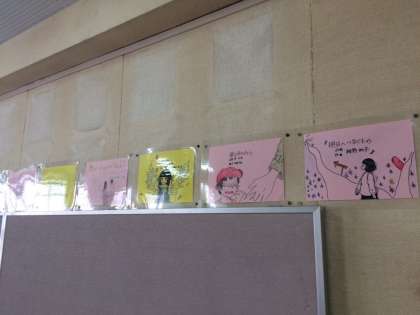 南港緑小学校の音楽室に、本校の生徒が描いた曲の紹介カードを掲示してもらいました。