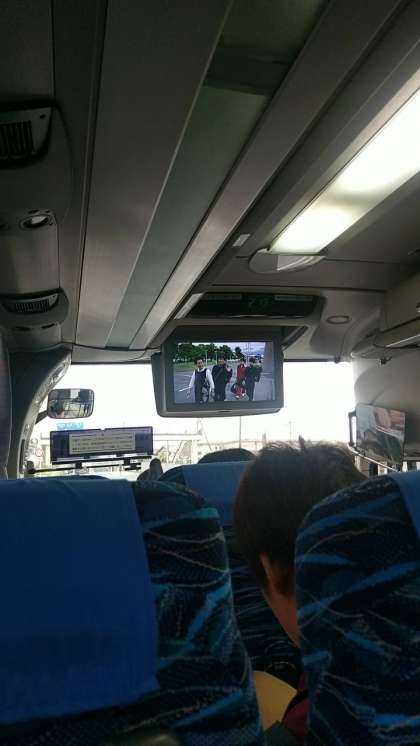 バスの中で、先生作った、修学旅行のスライドショーを見ながら大阪へ向かっています。