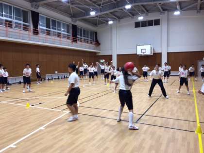 コートを4つに区切って、クラス別男女別の田んぼドッチボールです。