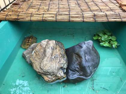 しばらく職員室前の水槽へ避難していましたが、昨日正門近くの新しい住処へとお引越しをしました。