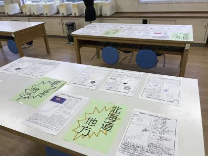被服室では社会の都道府県新聞と、英語の夏休みにやったことの紹介を英語で作ったものを展示していました。