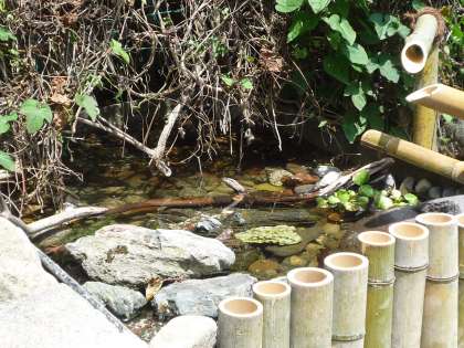 自然が魅力の南港地区にある本校は、より自然を身近に感じてもらおうと管理作業員さんがビオトープを造成しました。倉庫に眠っていた「トロ舟」や校内に自生している竹を再利用しました。また、黒メダカも放流しました。
