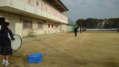 一番手前の生徒が太鼓をたたいて、音が聞こえたら旗をあげます。