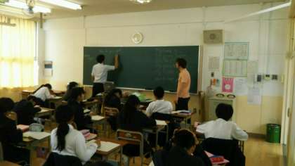 中学生の授業の様子です。社会は地図を開けて班学習、英語はC-NETのアダム・サイクス先生の授業、数学は前田先生・水野先生によるTTの授業です。どの授業も複数の教員で手厚く授業をおこなっています。