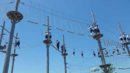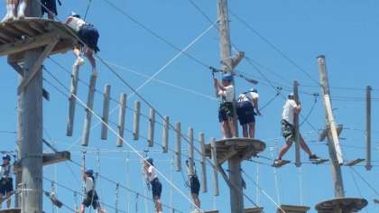 アドベンチャーにて奮闘中!天気もすばらしく、風は爽やか!絶好のコンディションです。見た目には凄く恐ろしいかんじですが、子どもたちは勇気を振り絞って果敢に攻めています!