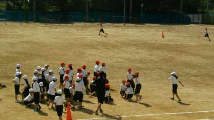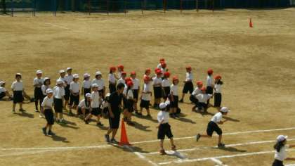 リレーをしています。「負けるな。」「頑張れ。」みんな必死です!!