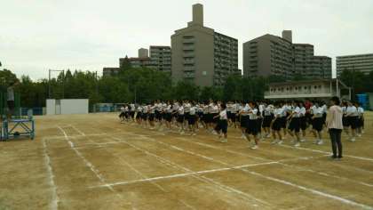 体育大会の全体練習を行いました。行進、体操、校歌、小学生との合同プログラム、応援合戦の練習をしました。
