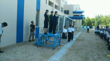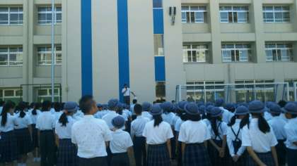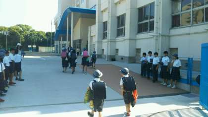 本日より1週間、小学校の児童会の運営委員による「あいさつ運動」が始まりました。初日だったので少しはずかしそうでしたが、慣れてきてがんばってくれることを期待しています。全校集会を運動場で行いました。校長先生から開校式のお話がありました。森ノ宮医療大学から保健室の見学実習(4日〜6日)として4人の大学生の紹介がありました。
