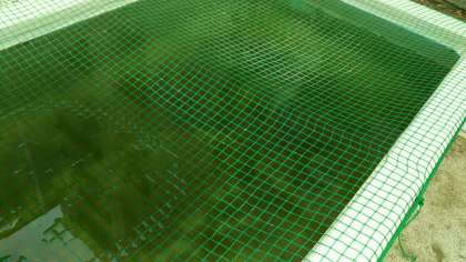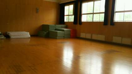格技室の内部です。学校の中庭に水槽があります。水槽には主(何でしょう?)がいます。