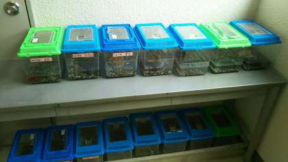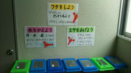 3階で2年生がザリガニを飼育して、その様子を観察しています。