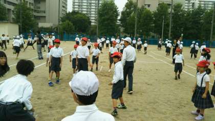 児童朝会で縦割りでドッチボールを行いました。雨の関係でグランドがあまり取れなかったので、狭い中で「キャー」でも大丈夫、ソフトボールなのであたってもOK!