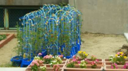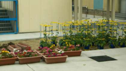 1年が栽培している朝顔、2年のトマト、PTAと合同で植えたプランターは順調に育っています。