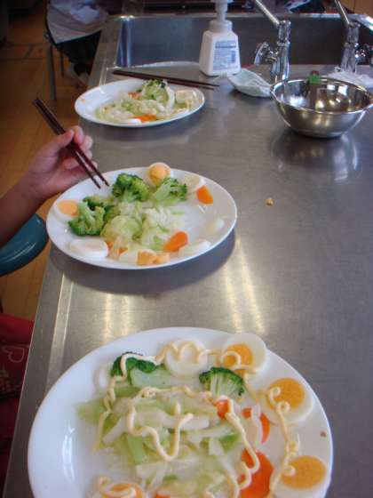 盛り付けはなかなか上手でした。フレンチソースやマヨネーズをかけて、カラフルゆで野菜サラダをおいしそうに食べていました。