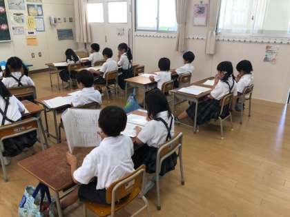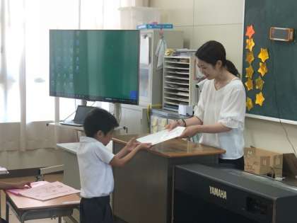 担任の先生から通知表をもらいました。1年生にとっては初めての通知表です。しっかりと受け取りました。