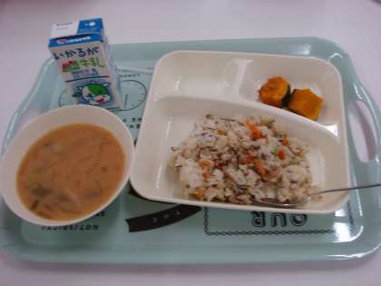 今日の給食では、豚ひき肉、もずく、切りこんぶ、にんじん、むき枝豆をご飯に混ぜたものが出されました。