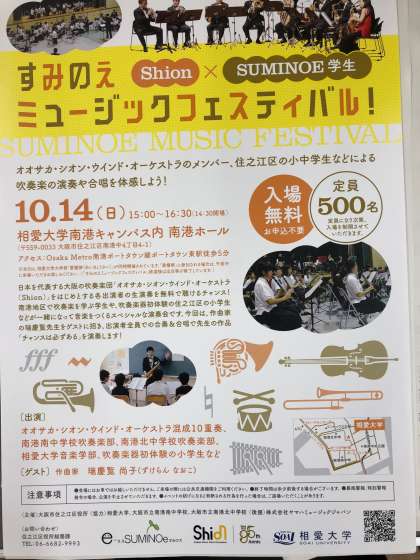 10月14日 日曜日に相愛大学南港ホールにてすみのえミュージックフェスティバルが開催されました。このイベントではオオサカシオンウインドオーケストラのみなさんや相愛大学の学生から吹奏楽楽器の体験レッスンを受け、住之江区の小学生が一緒になって音楽をつくるスペシャルなイベントです。