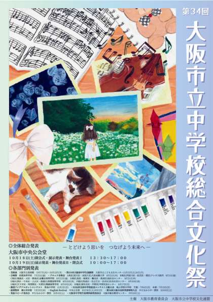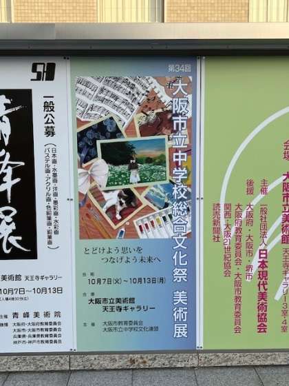 また、総合文化祭全体のポスターに本校生徒の作品がが選ばれ、大阪市美術館の入り口にも掲示されております。あわせて、大阪市内のすべての中学校でポスターが掲示されています。
