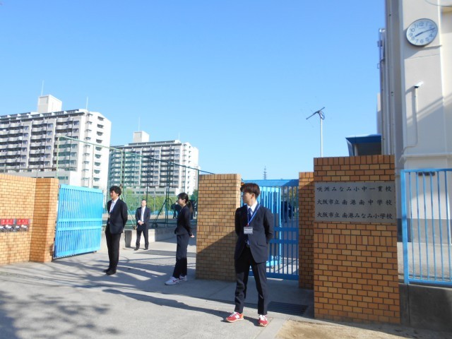 稲葉校長先生と教職員が登校を見守ってくれています。