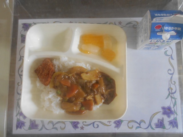 今日の給食は、入学祝い献立のカツカレーライスでした。フルーツゼリーもついていました。