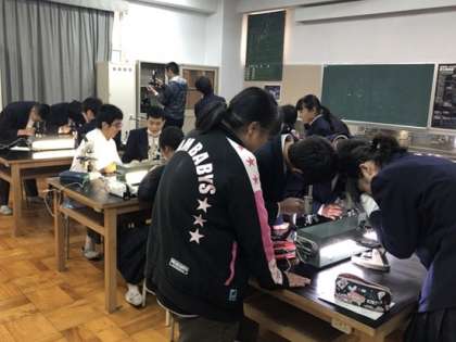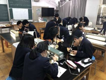 三年生は、理科の時間に、タマネギの細胞を観察しました。チームティーチングの授業で、分からないところはすぐ先生に聞くことができます。