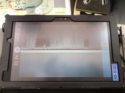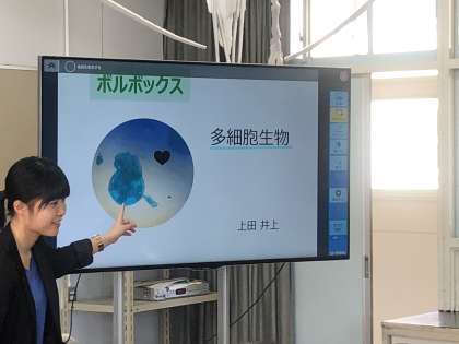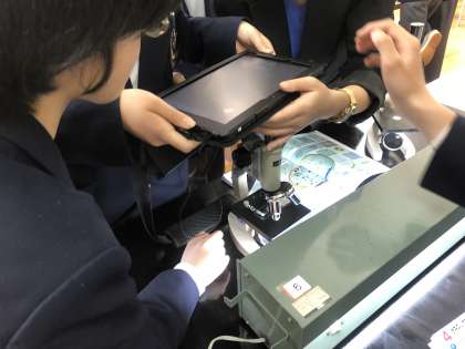 「主体的・対話的で深い学び」をタブレット端末の授業支援システムの発表ノートを使って発表していました。顕微鏡にタブレットのカメラを接続して写真を撮っている様子です。生徒が全員が参加型の授業ができています。また先生の指示もよく聞いています。このようなICTを使った授業改善が求められてきます