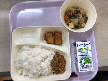鶏肉とジャガイモの煮物、あつあげのしょうゆだれかけ、紅鮭そぼろです。