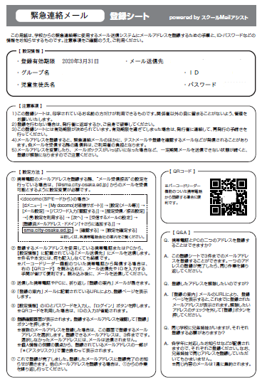 保護者メールのIDとパスワードを記載した案内を、お子様を通じて配布しております。本校からの緊急連絡(台風による臨時休業やインフルエンザによる対応・大阪市教育委員会からの連絡等)を、保護者の皆様の携帯電話等に情報提供します。右の用紙に書かれている内容をお読みいただいたうえで、QRコード等で登録をしていただき、学校からの連絡が、ダイレクトに保護者皆様にお伝えできるようご協力をお願いいたします。保護者の皆様のお手もとにない場合は、各担任へ再発行を申し出ていただいたらと思います。保護者メールの活用をよろしくお願いいたします。