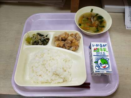 鶏肉のからあげ、中華スープ、チンゲンサイともやしの甘酢あえでした。