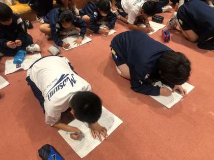 夜のつどいです。健康観察をしました。現在は怪我などもなく、1日の振り返りをしおりに書いています。本当によく頑張っています。