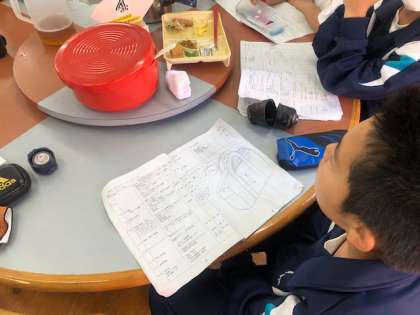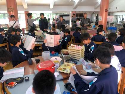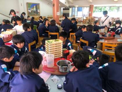 食後の後片付けをして、今後の行動について確認しています。子どもたちは、先生の指示に従ってしっかり動いています。