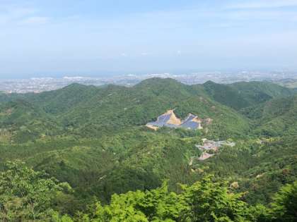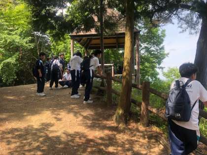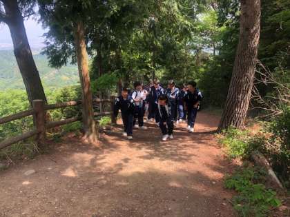山頂です。400メートルくらいです。結構きつい登りですが、子どもたちは校歌を歌いながら頑張って登っています。