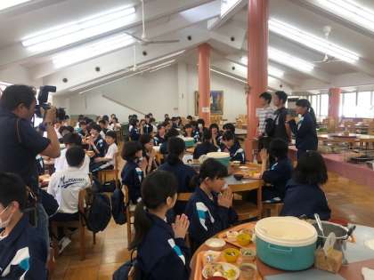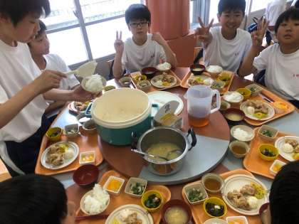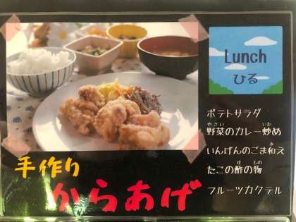 お昼は唐揚げです。しおりの時間通りに進んでいます。予定より学校に早く着く予定です。